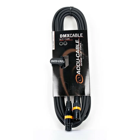 Accu-Cable’s AC3PDMX25 is a 25 ft 3-pin DMX cable with XLR connectors. 22 AWG stranded (0.15 x 19 ) tinned copper conductors, polyethylene insulation, twisted pair, polyethylene inner jacket, Duofoil® (100% coverage) and cotton plus a tinned copper braid shield (85% coverage), PVC jacket.