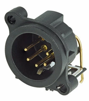 The Neutrik NC5MAH is a 5-pin XLR-M horizontal PCB mount connector with a separate ground contact to mating connector shell and front panel. This connector features a round plastic body and has the smallest size and packing density (23mm between centers) available from Neutrik. UL recognized component.