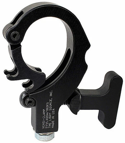 The Light Source’s Black Anodized Versi-Clamp is a lighting hardware clamp designed to wrap around the entire range of standard truss, from 2″ OD down to 1″ OD, all without marring the truss. The unique 2-position latch on the link saves time when switching from 2″ truss to a small truss, just connect to the second latch for the smaller sizes. The quick release handle takes only 2 turns to be able to drop the locking mechanism, and release the clamp from the truss.