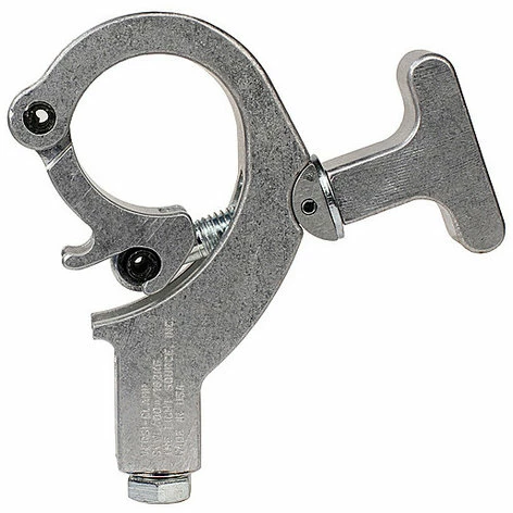 The Light Source’s Silver Versi-Clamp is a lighting hardware clamp designed to wrap around the entire range of standard truss, from 2″ OD down to 1″ OD, all without marring the truss. The unique 2-position latch on the link saves time when switching from 2″ truss to a small truss, just connect to the second latch for the smaller sizes. The quick release handle takes only 2 turns to be able to drop the locking mechanism, and release the clamp from the truss.